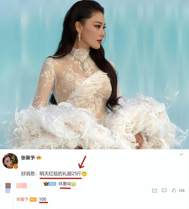 她自己透露礼服有25斤重,而她体重才100斤,拖着这么重的衣服走完红毯,满头都是汗。