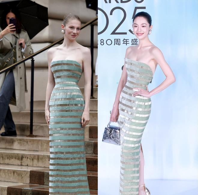钟楚曦这次更是让人刮目相看,她穿的条纹透视裙居然和国外超模亨特・莎弗撞衫了。